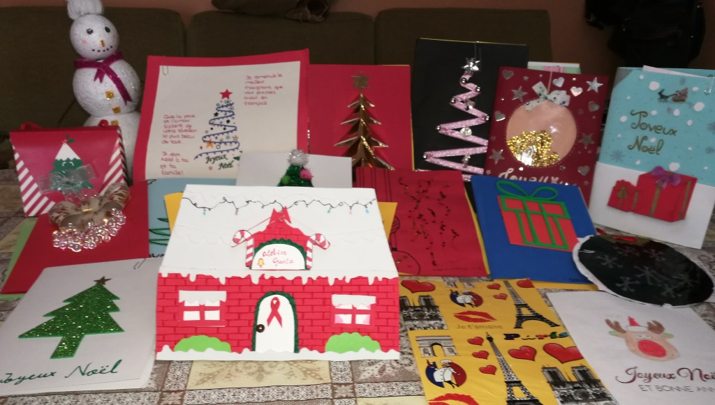 Tous les élèves du cours de Français de 4º ESO veulent souhaiter de joyeuses fêtes à leurs familles. Ils ont fait leurs propres cartes postales et après, ils les ont écrites.