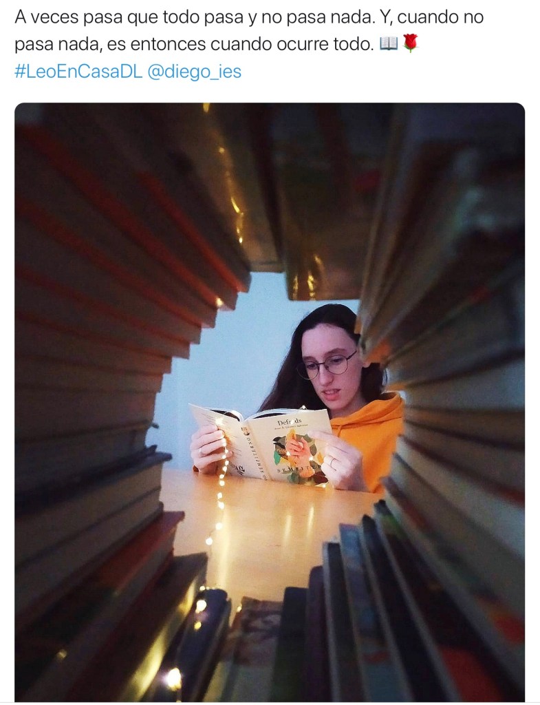 El pasado 23 de abril celebramos el Día del Libro por redes sociales. Muchos de nuestros alumnos publicaron fotografías leyendo en casa con el hashtag #LeoEnCasaDL. Anunciamos que la fotografía más original recibiría un regalo. Pues esta que veis arriba ha sido la afortunada.