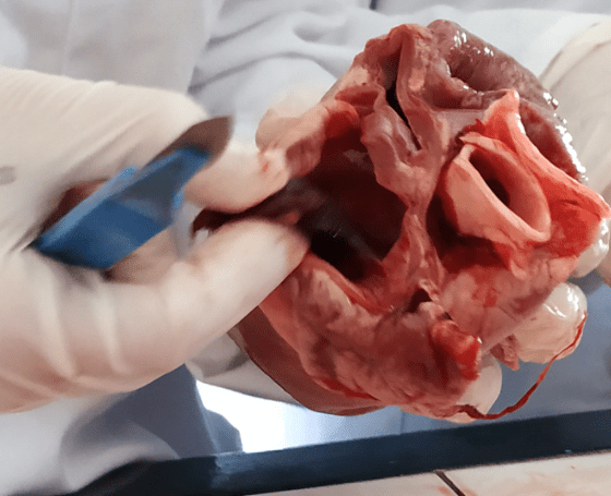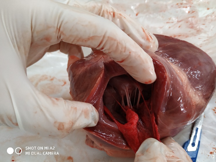 El proceso de disección nos permitió observar las principales arterias y venas de entrada y salida del corazón (arteria pulmonar, arteria aorta, venas pulmonares y venas cavas), las aurículas y ventrículos, surco interventricular y surco auriculoventricular, así como los músculos papilares, válvulas y el propio miocardio.