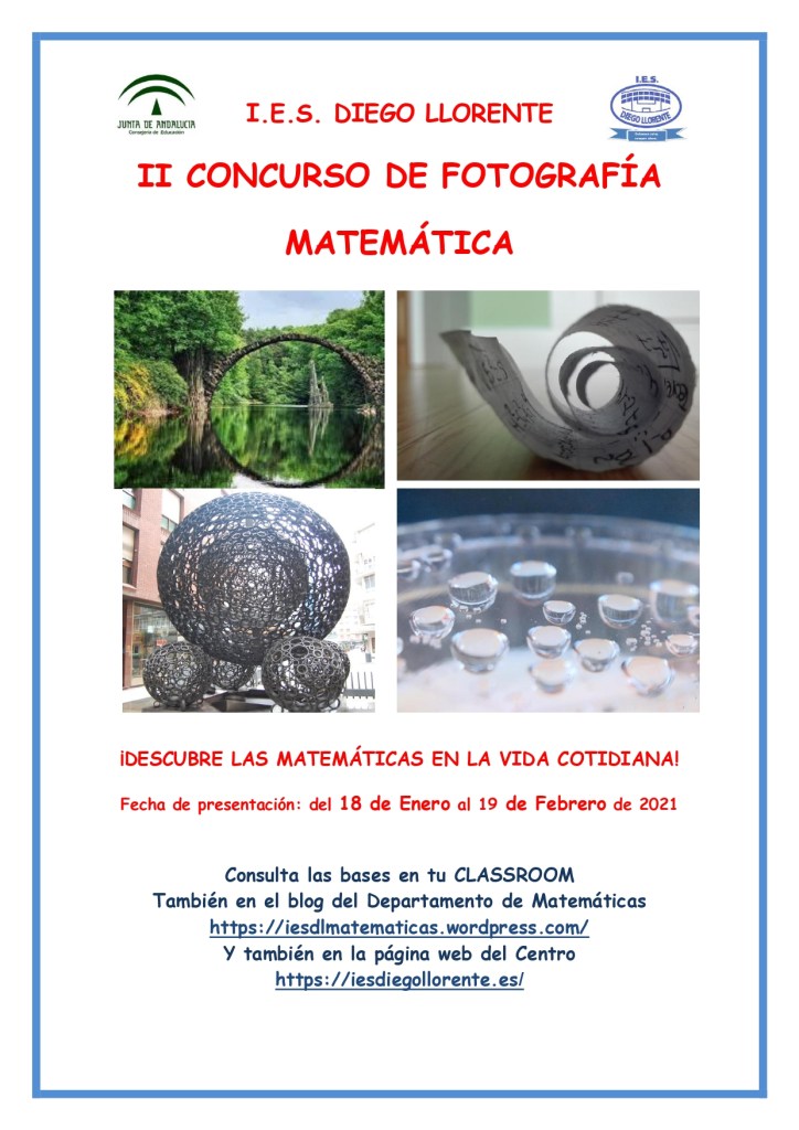 Vivimos rodeados de Matemáticas: en la calle, en el supermercado, en nuestro centro, en nuestras casas, en la naturaleza, en el arte, hasta en el móvil…. ¿Por qué no fotografiarlas? El objetivo fundamental que nos proponemos al convocar este Concurso es que los alumnos/as desarrollen su creatividad e imaginación para ver y apreciar los múltiples aspectos de nuestro entorno que están relacionados con las Matemáticas.