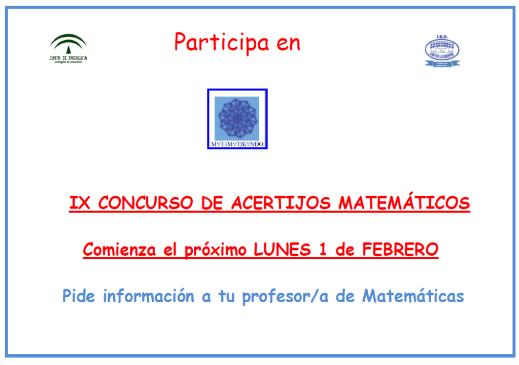 Desde el Departamento de Matemáticas os proponemos que le deis un poco al coco para resolver una serie de retos matemáticos, porque lo que no se usa se atrofia. El concurso, que este año cumple su novena edición, consta de cuatro acertijos para primero y segundo de la ESO y otros cuatro para tercero y cuarto de la ESO. Os presentaremos un acertijo cada semana.