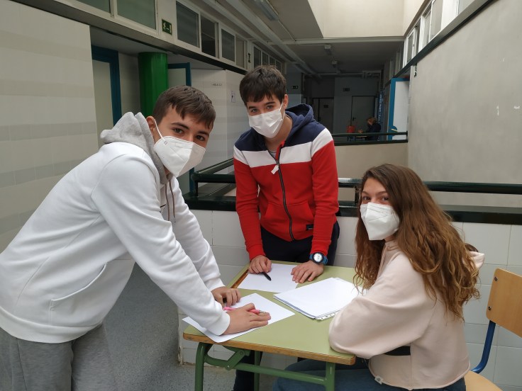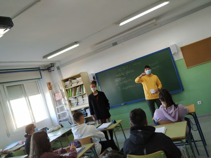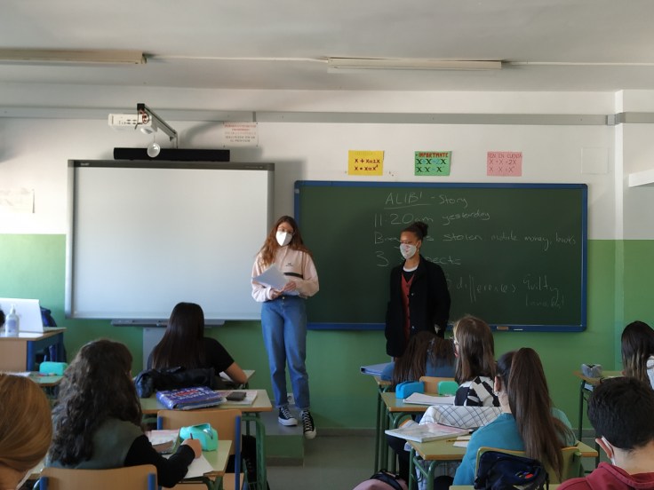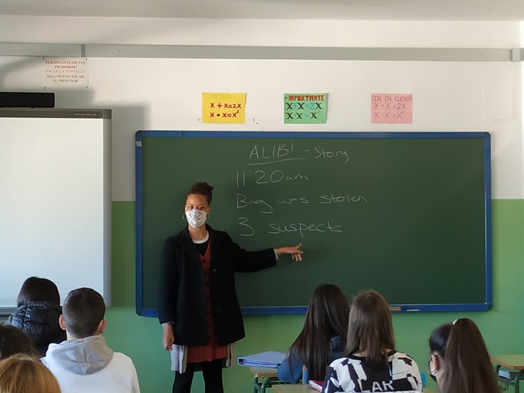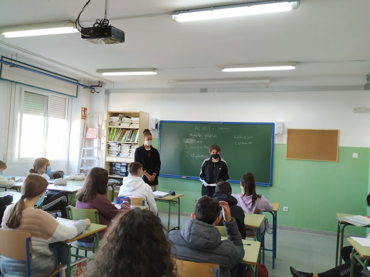 Nuestro alumnado de 3º ESO A y B ha disfrutado con Kira (nuestra auxiliar de conversación) del juego Alibi, eminentemente comunicativo, en el que tres alumnos han tenido que pactar una coartada (alibi) y el resto del alumnado tiene que desmontarla haciendo preguntas para encontrar fallos en su argumentación. Aquí se recoge una muestra del juego.