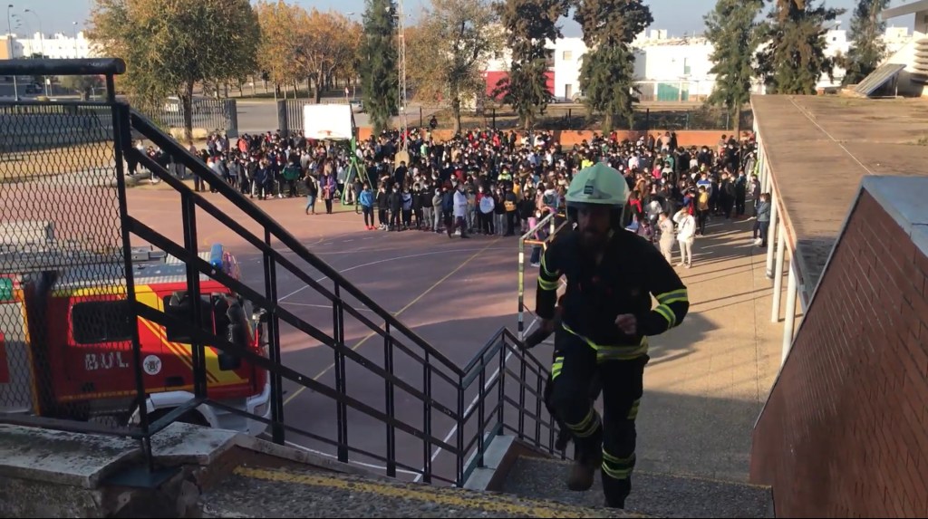 Esta formación nos sirvió para ponernos en situación para el simulacro de incendio que se llevó a cabo el jueves 25 de noviembre. Dicha actuación comenzó a las 9:30 de la mañana con una situación de emergencia en la que una alumna detectó un fuego ficticio en la biblioteca del centro y alertó al profesor más cercano. A partir de ahí, se puso en marcha el Plan de Emergencias en el que se alerta a los bomberos, a través del Centro Regional del Servicio de Extinción de Incendios, llamando al 085. El edificio al completo se evacuó en cuatro minutos y los bomberos acudieron al lugar en menos de ocho minutos desde el momento que fueron avisados.