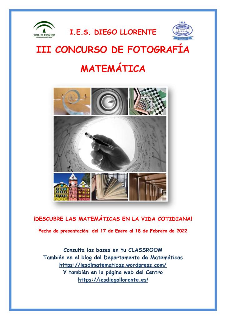 Vivimos rodeados de Matemáticas: en la calle, en el supermercado, en nuestro centro, en nuestras casas, en la naturaleza, en el arte, hasta en el móvil…. ¿Por qué no fotografiarlas? El objetivo fundamental que nos proponemos al convocar este Concurso es que los alumnos/as desarrollen su creatividad e imaginación para ver y apreciar los múltiples aspectos de nuestro entorno que están relacionados con las Matemáticas.