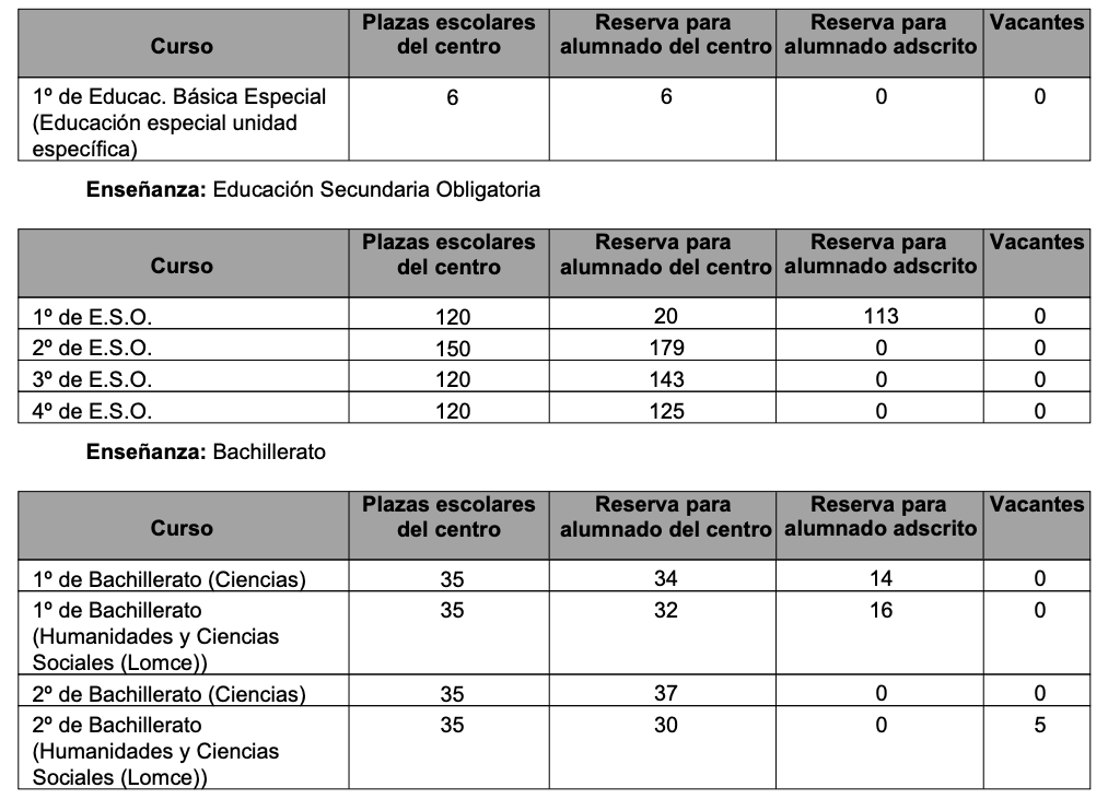 Conforme a lo dispuesto en el artículo 6.4 del Decreto 21/2020, la Delegación Territorial de la Consejería de Educación y Deporte ha establecido que se reserven 113 plazas para el alumnado procedente de los centros adscritos, de las que 53 plazas lo serán para el alumnado procedente del C.E.I.P. Pablo Ruiz Picasso – 41009974, 8 plazas lo serán para el alumnado procedente del C.P.R. Los Girasoles – 41000508, 13 plazas lo serán para el alumnado procedente del C.E.I.P. Maribáñez – 41003091 y 39 plazas lo serán para el alumnado procedente del C.E.I.P. Profesora María Doña – 41009214.