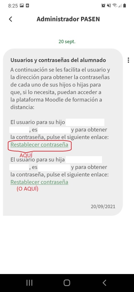 En la siguiente pantalla aparecerán los códigos de usuario de todos los hijos/as de la familia y sólo hay que darle a «Restablecer contraseña». Se recomienda apuntar la nueva contraseña, comprobar que se puede acceder a la cuenta del alumno y a continuación cambiar la contraseña por otra que se recuerde mejor.