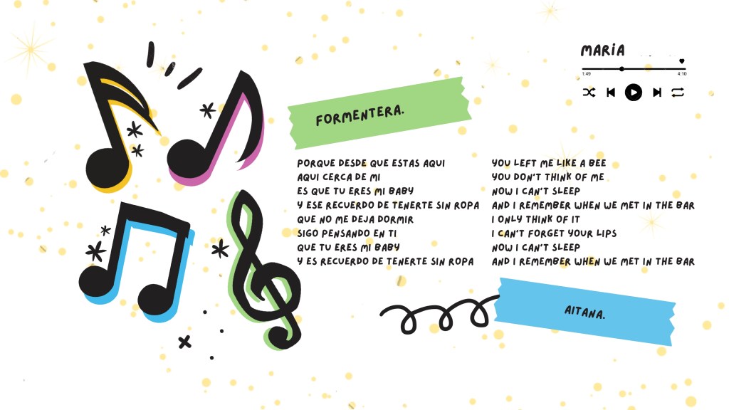 Juan Carlos J. trabajó esta actividad propuesta por el programa ComunicA con sus alumnos del grupo 1 de Ampliación de inglés de 4º ESO. Para ello, estudiaron la rima, el conteo de sílabas en los versos, la sinalefa, y cómo encontrar palabras que riman entre versos para trabajar canciones actuales (con letra española, para que los alumnos pudieran contar las sílabas más fácilmente.) Posteriormente, los alumnos escribieron su propia versión, con un tema parecido o diferente… ¡Incluso algunos se atrevieron a cantarla! Se les prometió no divulgar su voz por las redes, pero consideramos que algunos de los productos finales son dignos de ser compartidos. Os dejamos una verisón de Formentera, de Aitana Ocaña,