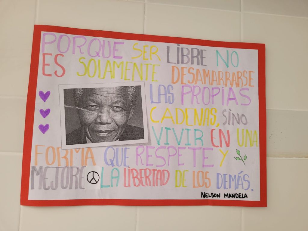 - Trabajos sobre figuras representativas de la lucha por la paz con una frase que los identifica: Nelson Mandela, Gandhi, Malala, Rigoberta Menchú.