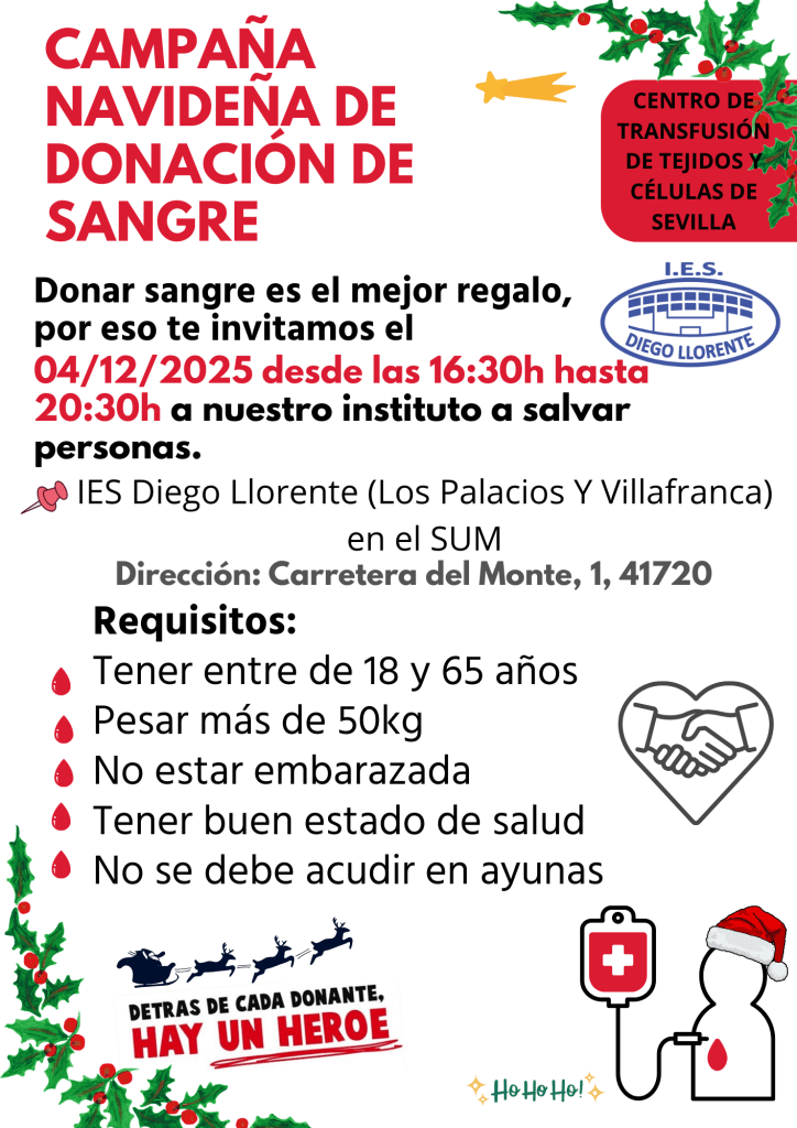 A poco menos de un mes para la llegada de las vacaciones navideñas, el I.E.S. Maestro Diego Llorente quiere contribuir al mejor regalo posible: una gota de vida. Así, gracias al Centro de Transfusión de Tejidos y Células de Sevilla, hemos organizado una campaña de donación de sangre, que se llevará a cabo el 4 de diciembre, de 16:30h a 20:30h, en nuestra Sala de Usos Múltiples (SUM). Es importante recordar que toda persona que desee donar debe tener entre 18 y 65 años de edad, pesar más de 50kg y no estar embarazada.