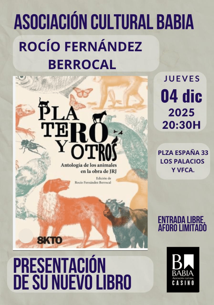 Nuestra compañera Rocío Fernández Berrocal, doctora en Filología y especialista en la obra de Juan Ramón Jiménez, presenta su nuevo libro «Platero y otros» el día 4 de diciembre en la Asociación Cultural Babia de Los Palacios y Villafranca a las 20:30 h.